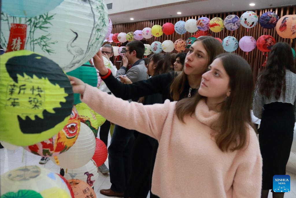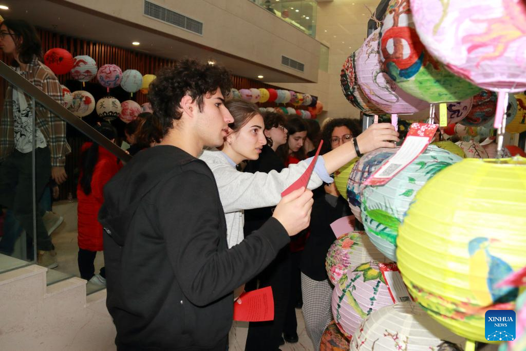 Participants view exhibited works of a lantern drawing contest in Sofia, Bulgaria, Feb. 22, 2024. (Photo by Marian Draganov/Xinhua)
