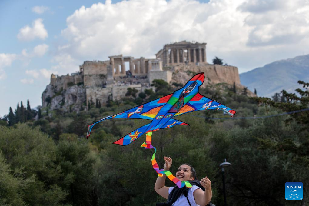 People fly kites on the occasion of Clean Monday in Athens, Greece, on March 18, 2024. (Xinhua/Marios Lolos)