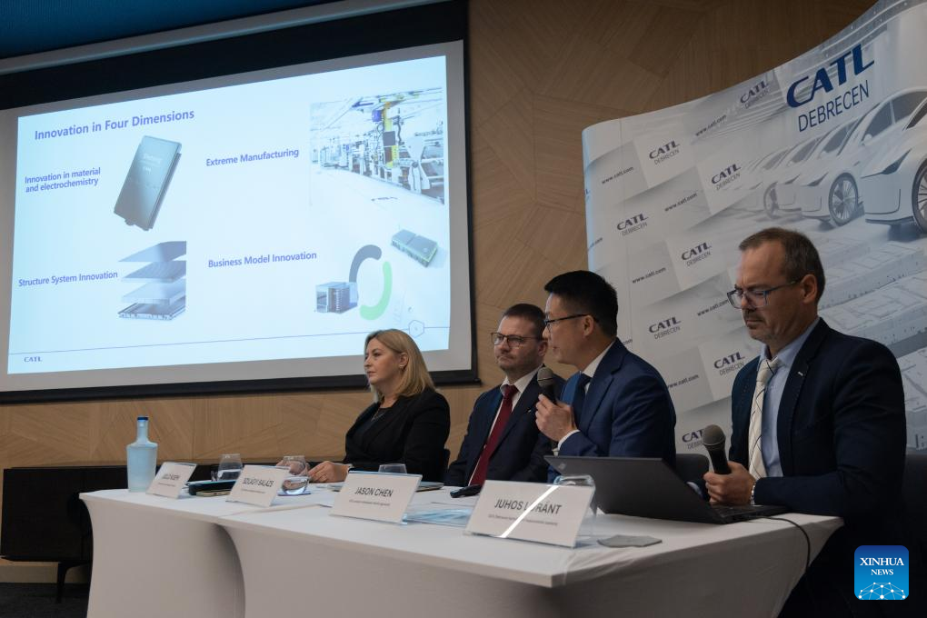 Jason Chen (2nd R), general manager of CATL Europe Operations, speaks at a press conference in Debrecen, Hungary, on Nov. 20, 2024. (Photo by Attila Volgyi/Xinhua)