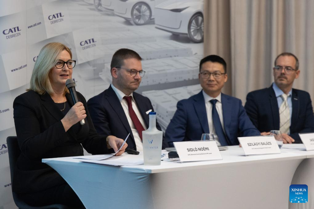 Noemi Sidlo (1st L), CATL's communications and public relations manager, speaks at a press conference in Debrecen, Hungary, on Nov. 20, 2024. (Photo by Attila Volgyi/Xinhua)