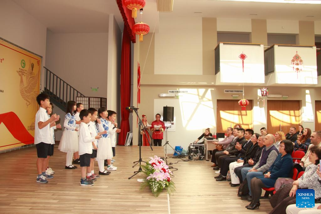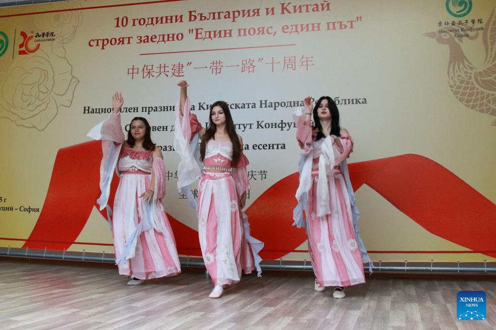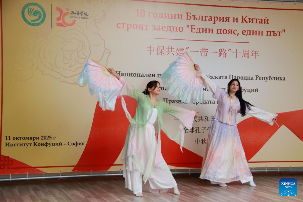Students perform during a cultural event organized by the Confucius Institute in Sofia, Bulgaria, Oct. 11, 2025. The event was held to mark the 76th anniversary of the founding of the People's Republic of China, the Mid-Autumn Festival, and the Global Confucius Institute Day. (Photo by Marian Draganov/Xinhua)