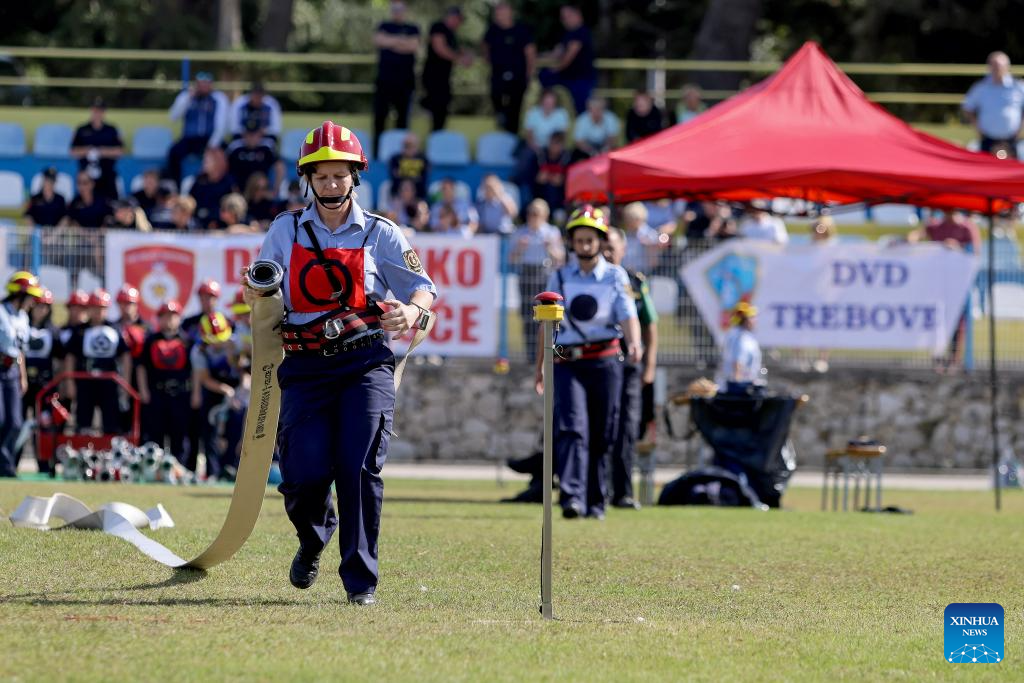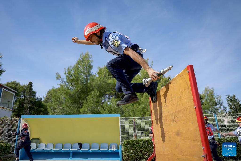 A firefighter competes during the 9th National Firefighters' Competition in Novalja, Croatia on Oct. 11, 2025. (Sime Zelic/PIXSELL via Xinhua)