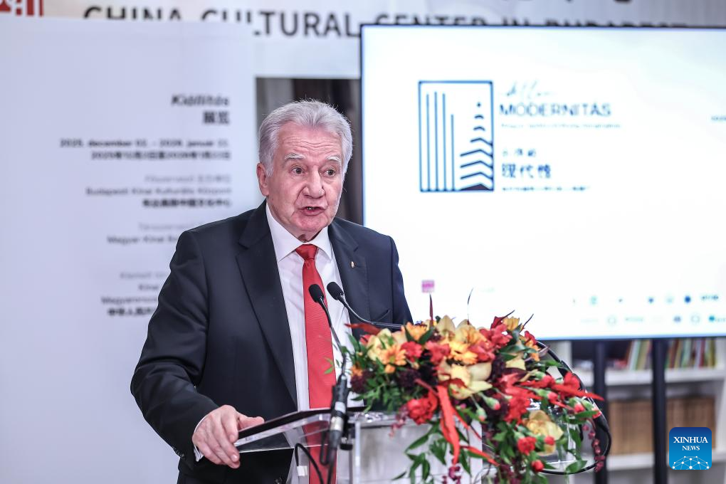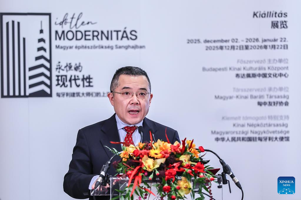 Chinese Ambassador to Hungary Gong Tao speaks at the opening ceremony of the exhibition "Timeless Modernity -- The Shanghai Legacy of Hungarian Architects" in Budapest, Hungary, Dec. 1, 2025. The exhibition opened in Budapest on Monday, highlighting the contributions of Hungarian architects to Shanghai's urban development in the first half of the 20th century.