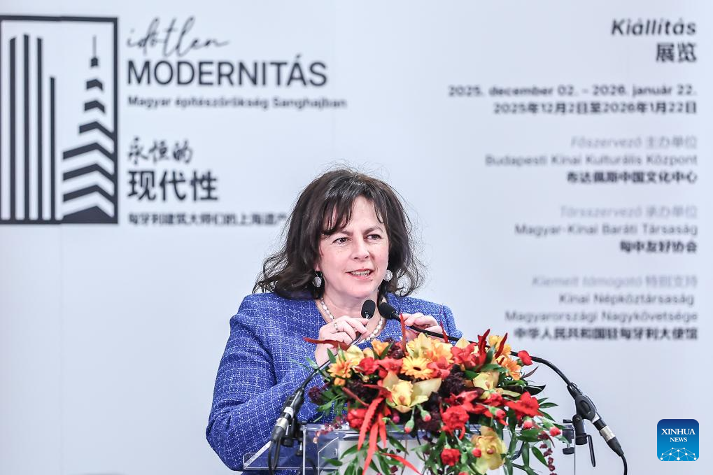 Judit Eva Nagy, president of the Hungarian-Chinese Friendship Association, speaks at the opening ceremony of the exhibition "Timeless Modernity -- The Shanghai Legacy of Hungarian Architects" in Budapest, Hungary, Dec. 1, 2025. The exhibition opened in Budapest on Monday, highlighting the contributions of Hungarian architects to Shanghai's urban development in the first half of the 20th century.
