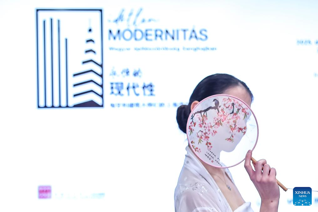 A performer dressed in traditional Chinese costumes dances at the opening ceremony of the exhibition "Timeless Modernity -- The Shanghai Legacy of Hungarian Architects" in Budapest, Hungary, Dec. 1, 2025. The exhibition opened in Budapest on Monday, highlighting the contributions of Hungarian architects to Shanghai's urban development in the first half of the 20th century.