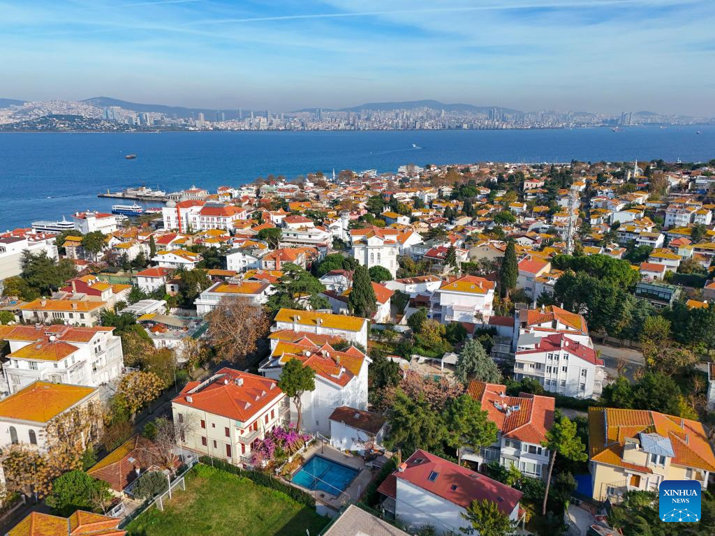 An aerial drone photo taken on Dec. 4, 2025 shows houses on Buyukada Island in Istanbul, Türkiye. Buyukada Island, located in the Sea of Marmara and well known for its scenic beauty, is a popular getaway destination for locals and visitors. (Xinhua/Liu Lei)