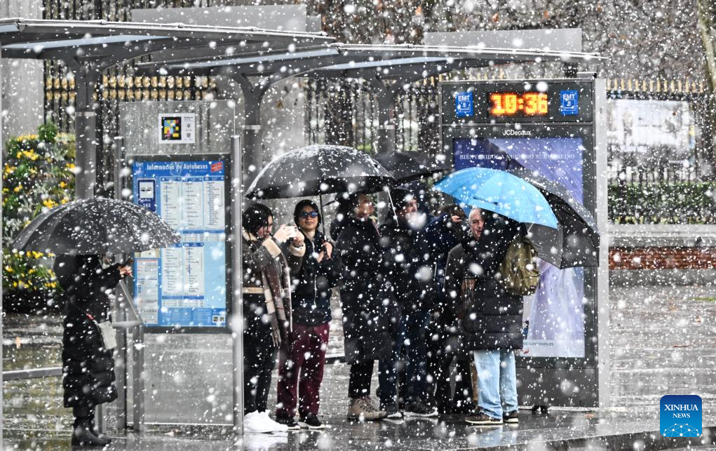 People wait for the bus in snow in Madrid, Spain, Jan. 28, 2026. (Xinhua/Cheng Min)