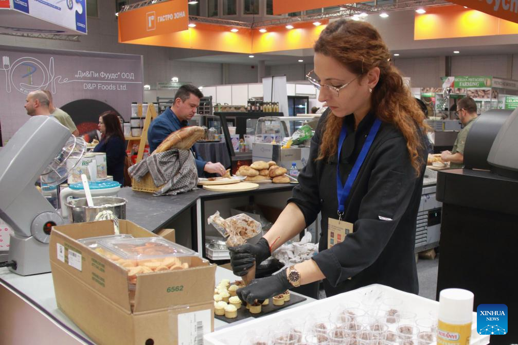 An exhibitor prepares products for tasting in a booth at the SIHRE exhibition in Sofia, Bulgaria, Jan. 27, 2026. The 23rd edition of the international exhibition SIHRE kicked off in the Inter Expo Center here on Tuesday offering products and services for restaurants, hotels, and the catering industry. (Photo by Marian Draganov/Xinhua)