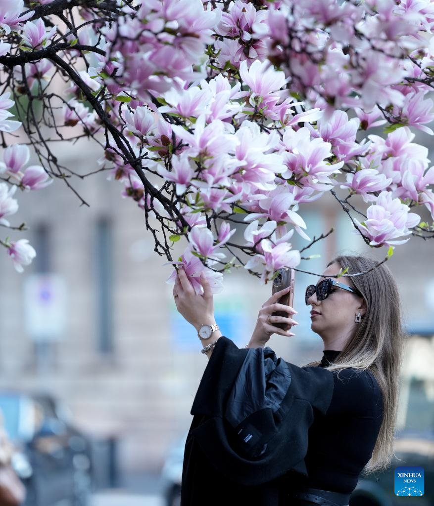 A woman takes photos of magnolia blossoms in Milan, Italy, March 13, 2026. (Xinhua/Li Jing)