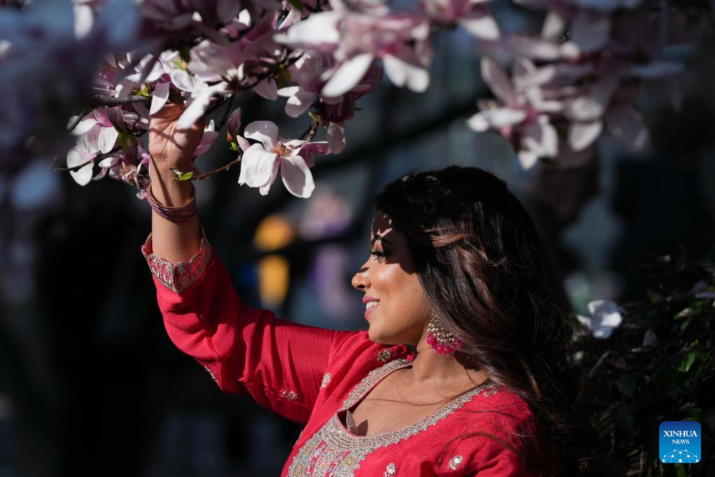 A woman poses for photos with magnolia blossoms in Milan, Italy, March 13, 2026. (Xinhua/Li Jing)