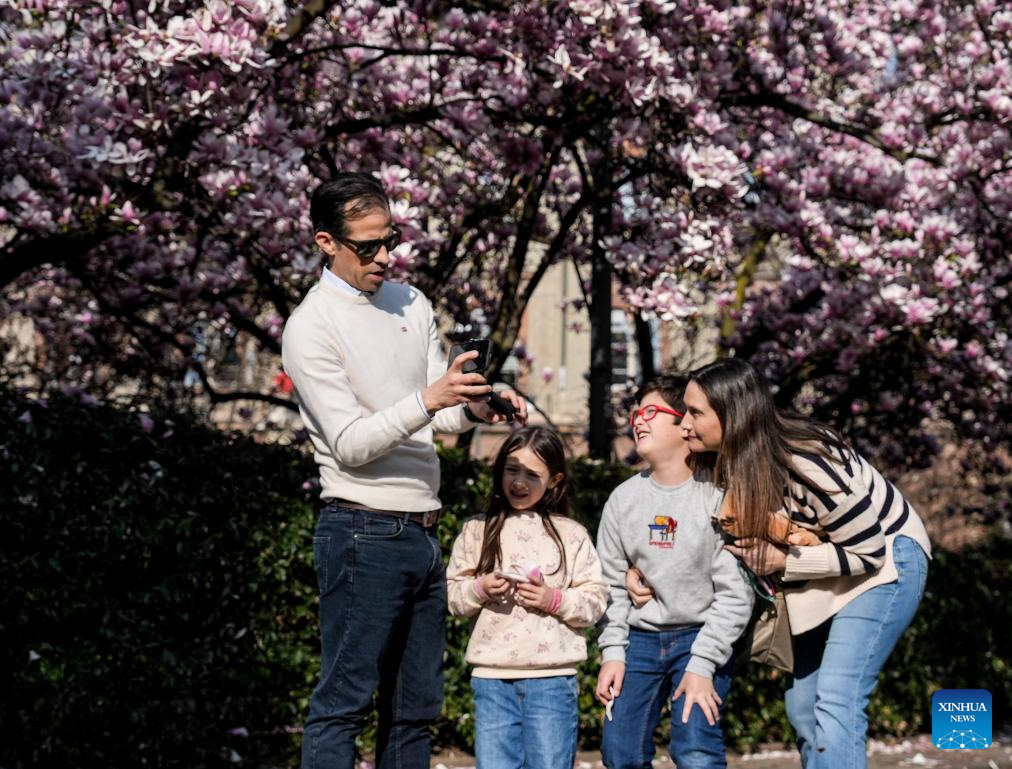 People view magnolia blossoms in Milan, Italy, March 13, 2026. (Xinhua/Li Jing)