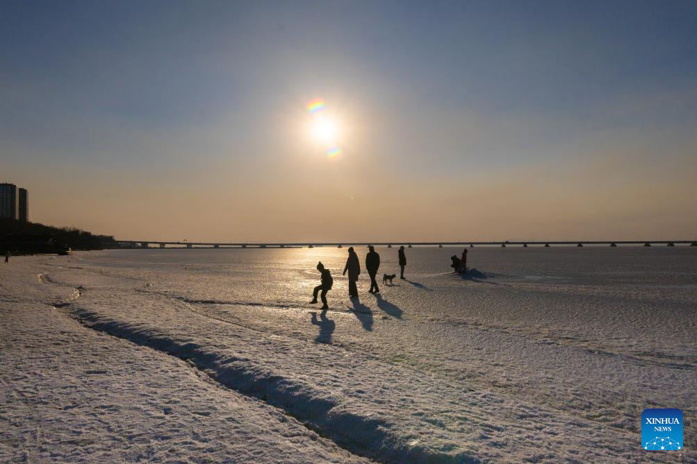 People stroll on the sea ice in Vladivostok, Russia, on March 15, 2026. As temperature rises, the frozen sea surface around Vladivostok is slowly melting. (Photo by Andrey Matveenko/Xinhua)