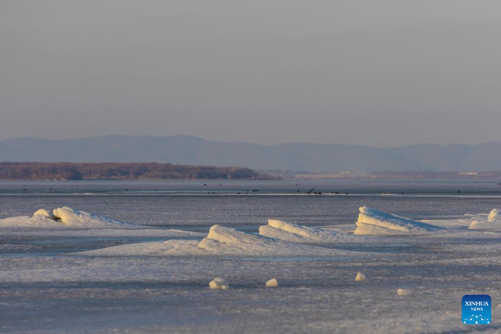 This photo taken on March 15, 2026 shows melting sea ice in Vladivostok, Russia. As temperature rises, the frozen sea surface around Vladivostok is slowly melting. (Photo by Andrey Matveenko/Xinhua)