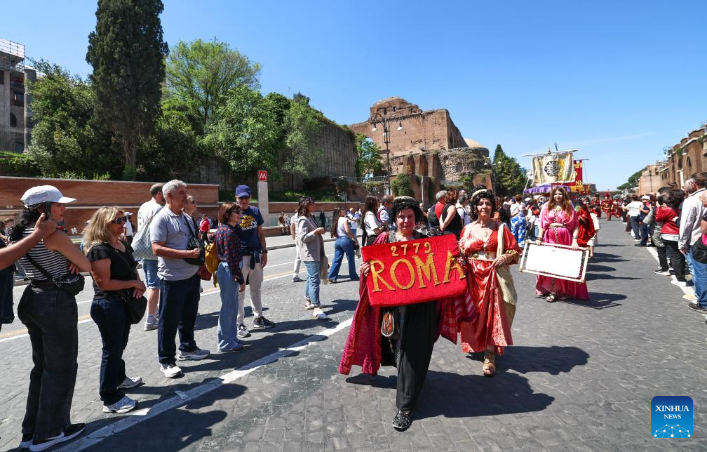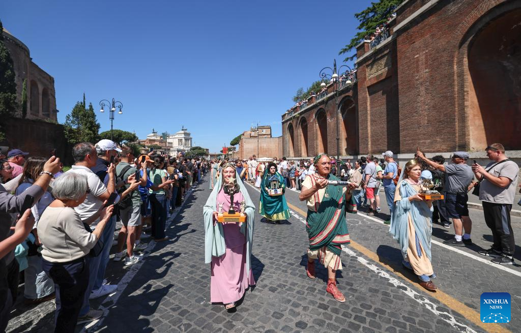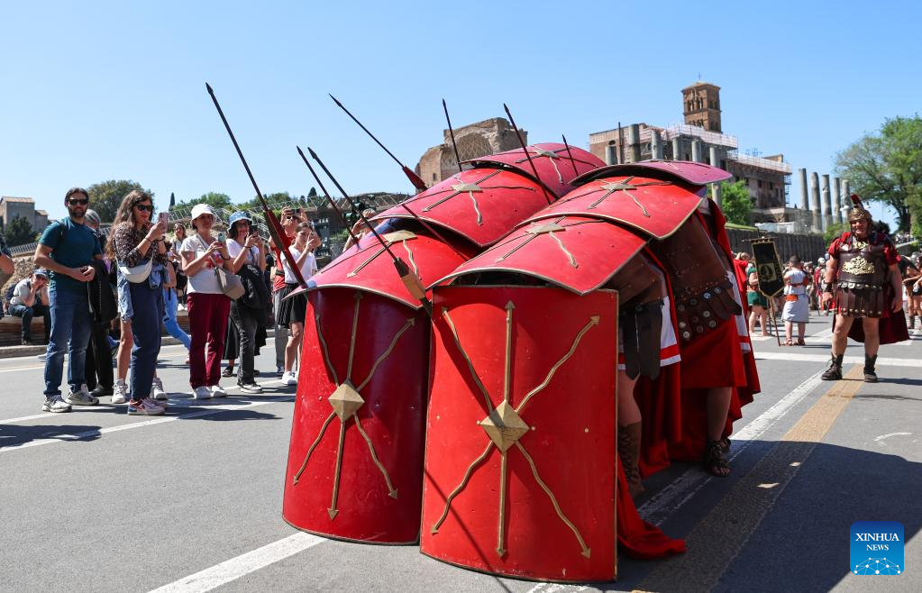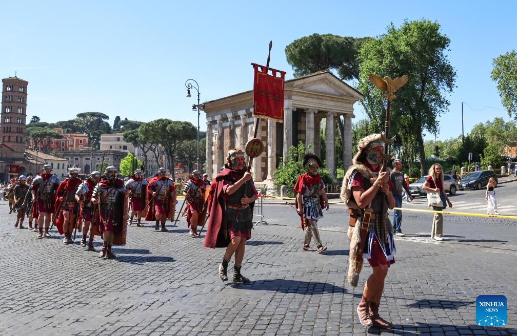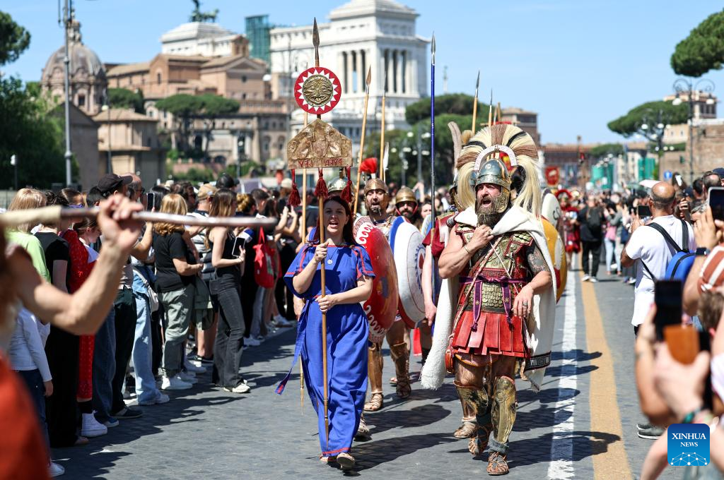 People take part in a parade in Rome, Italy to celebrate the city's 2,779th birthday, April 19, 2026. The city of Rome holds various activities to celebrate the upcoming 2,779th anniversary of its legendary foundation with historical re-enactments of ancient Roman rituals. (Xinhua/Wang Kaiyan)