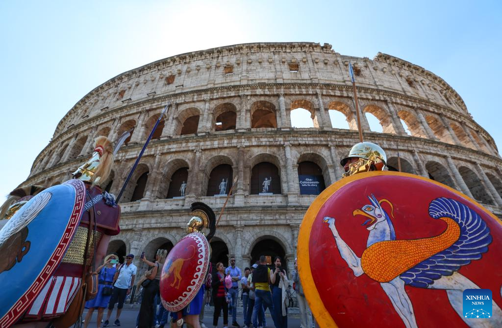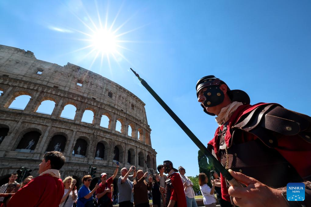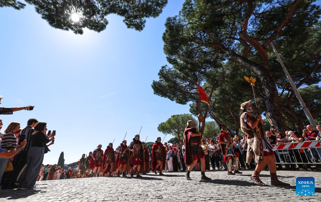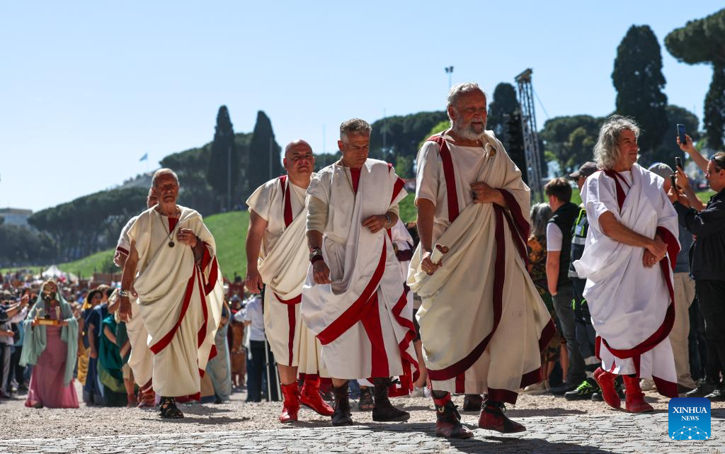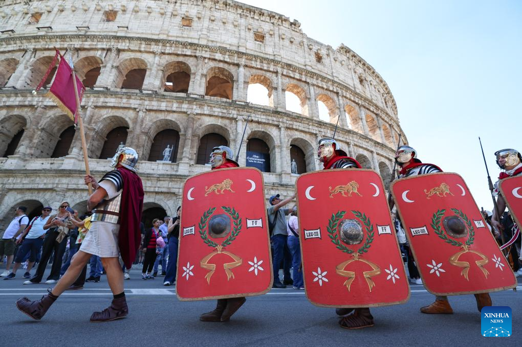 People take part in a parade in Rome, Italy to celebrate the city's 2,779th birthday, April 19, 2026. The city of Rome holds various activities to celebrate the upcoming 2,779th anniversary of its legendary foundation with historical re-enactments of ancient Roman rituals. (Xinhua/Wang Kaiyan)