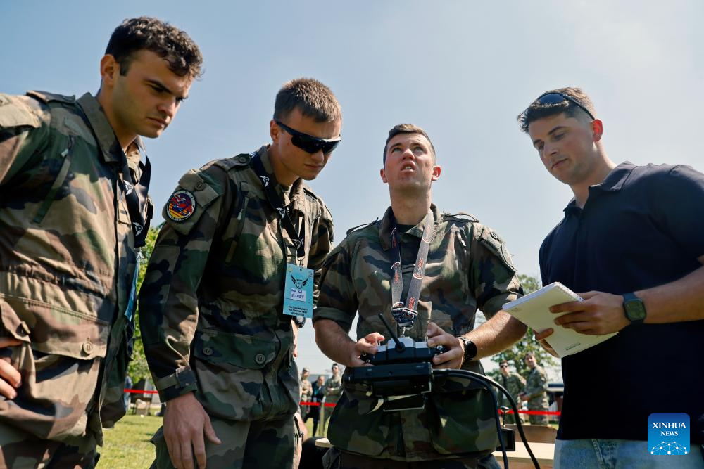 Members of a French military student team operates a drone during the Military Student Multirotor Fest, near Bucharest, Romania, April 28, 2026. Military students from Bulgaria, France and Romania participate in the 3-day event, competing with their self-built equipment to demonstrate their technical and piloting skills. (Photo by Cristian Cristel/Xinhua)