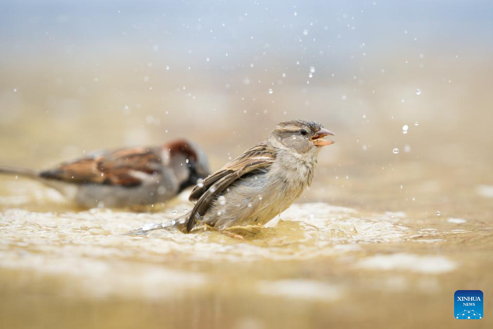 Sparrows are seen in water in the Old Town in Warsaw, Poland, on April 28, 2026. (Photo by Jaap Arriens/Xinhua)