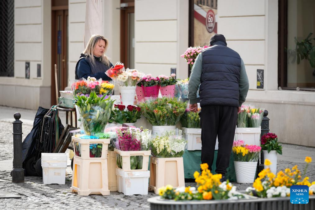 People buy flowers in the Old Town in Warsaw, Poland, on April 28, 2026. (Photo by Jaap Arriens/Xinhua)