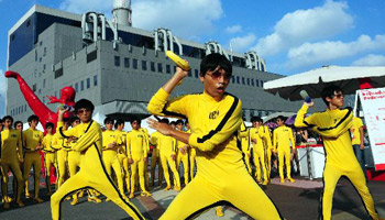 Fans of Bruce Lee imitate idol's actions in Shanghai World Expo Park