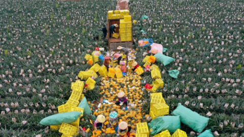 Farmers pack pineapples in Dapo Town of Haikou, China's Hainan