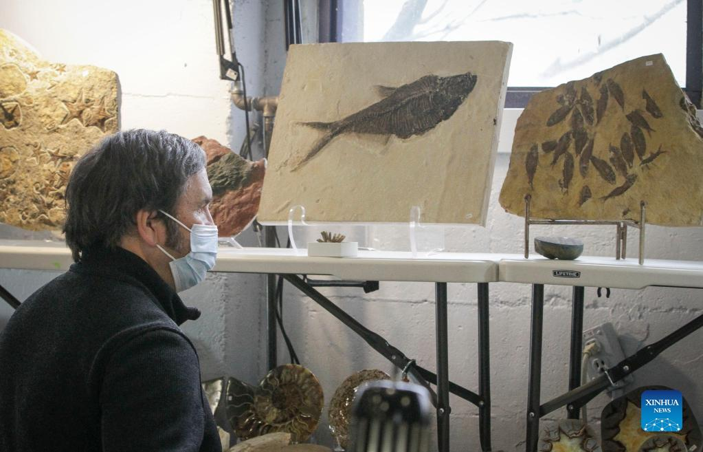 A visitor looks at fossil stones during the Gem and Mineral Show in Vancouver, British Columbia, Canada, on March 25, 2022. The three-day show features about 100 vendors from across Canada with their gem, mineral and rare fossil collections. (Photo by Liang Sen/Xinhua)