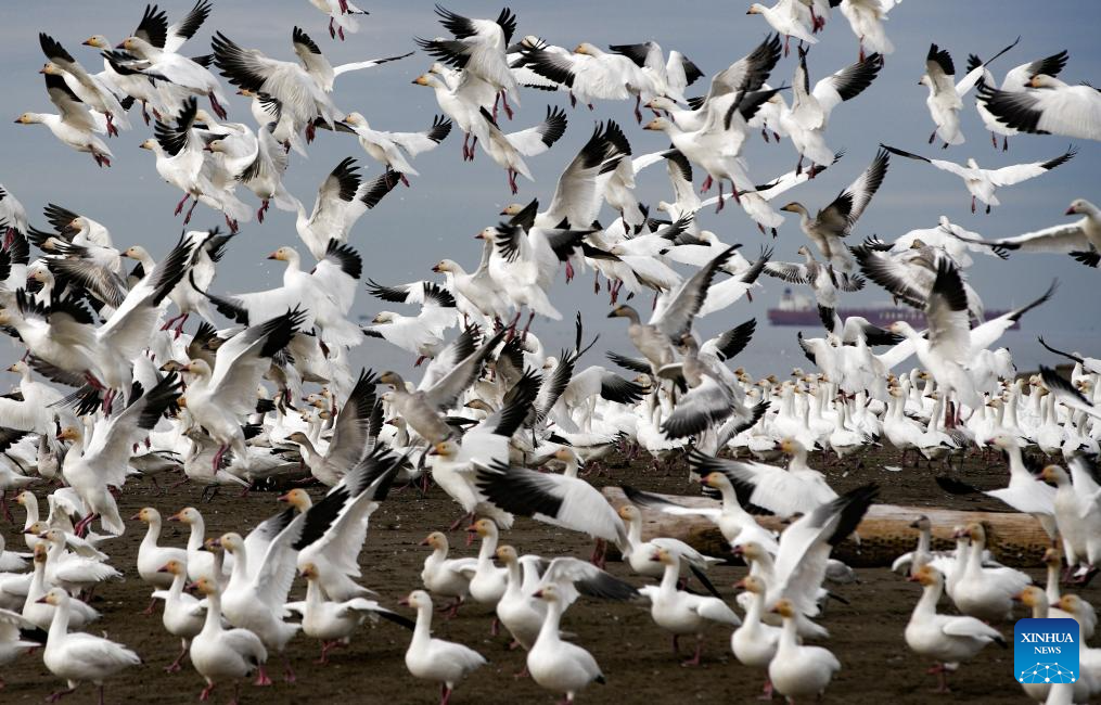Each year, tens of thousands of snow geese migrate from Russia's Siberia to southern British Columbia of Canada and U.S. state of Washington to feed and rest before flying south to California for wintering. (Photo by Liang Sen/Xinhua)