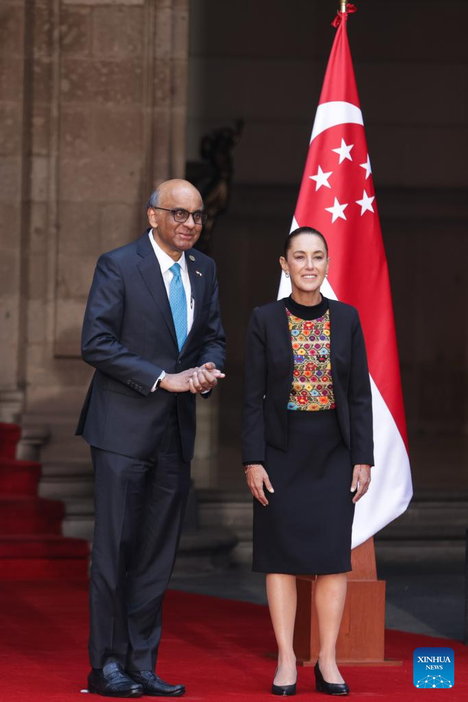 Mexican President Claudia Sheinbaum (R) hosts a welcome ceremony for visiting Singaporean President Tharman Shanmugaratnam at the National Palace in Mexico City, Mexico, on Dec. 1, 2025. (Photo by Francisco Canedo/Xinhua)
