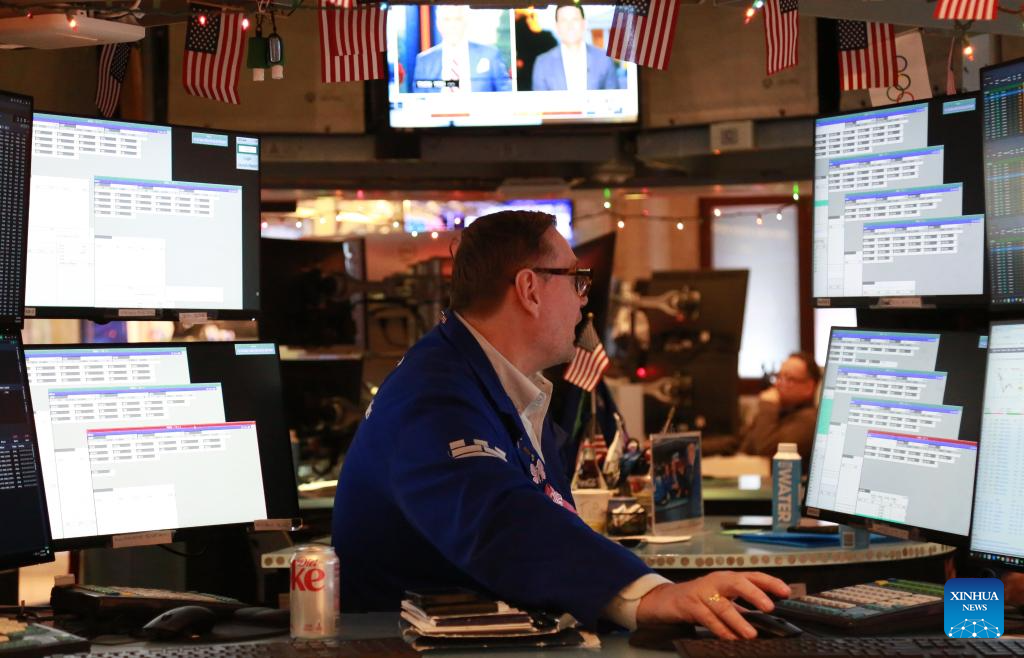 A trader works on the floor of the New York Stock Exchange in New York, the United States, on Dec. 12, 2025. U.S. stocks ended lower on Friday. The Dow Jones Industrial Average fell by 245.96 points, or 0.51 percent, to 48,458.05. The S&P 500 sank 73.59 points, or 1.07 percent, to 6,827.41. The Nasdaq Composite Index shed 398.69 points, or 1.69 percent, to 23,195.17. (Xinhua/Liu Yanan)