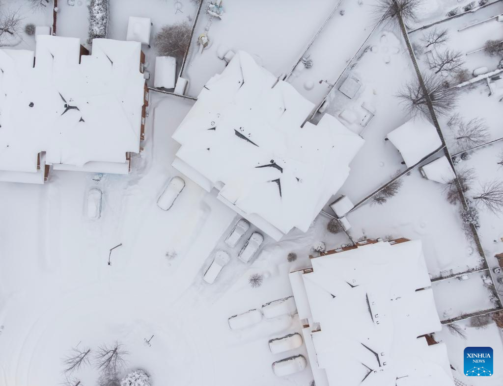 An aerial drone photo taken on Jan. 26, 2026 shows a snow-covered residential area in Oakville, the Greater Toronto Area, Canada. (Photo by Zou Zheng/Xinhua)