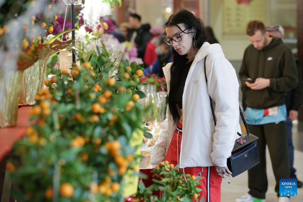 A customer selects flowers at a Chinese New Year flower and gift fair at Aberdeen Center in Richmond, British Columbia, Canada, on Feb. 12, 2026. (Photo by Liang Sen/Xinhua)
