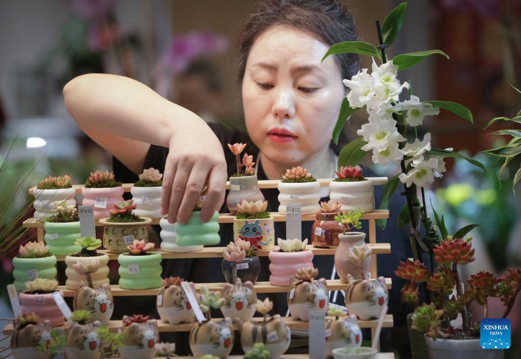 A vendor prepares plants at a Chinese New Year flower and gift fair at Aberdeen Center in Richmond, British Columbia, Canada, on Feb. 12, 2026. (Photo by Liang Sen/Xinhua)