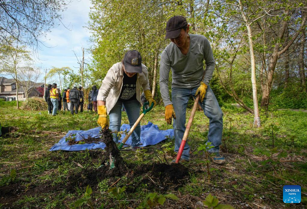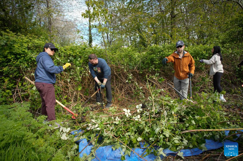 Volunteers remove invasive plants during an event marking the upcoming Earth Day in Vancouver, British Columbia, Canada, on April 19, 2026. (Photo by Liang Sen/Xinhua)