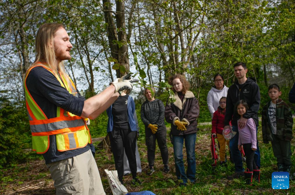 Volunteers learn to identify invasive species during an event marking the upcoming Earth Day in Vancouver, British Columbia, Canada, on April 19, 2026. (Photo by Liang Sen/Xinhua)