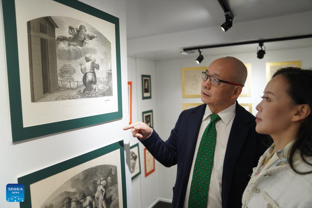 An event organizer (L) introduces a rare print of a work created by Raphael during an exhibition in New York, the United States, April 25, 2026. New York-based Murray Hill Art Museum on Saturday unveiled an exhibition of rare prints of works by Italian Renaissance master Raphael. Raffaello di Giovanni Santi (1483-1520), known as Raphael, is widely regarded as one of the masters of the Italian Renaissance. The exhibition brings together 100 rare engravings and lithographs from its own collection, along with loans from private collectors across the United States. A number of artists and collectors from the New York metropolitan area attended the opening ceremony. After closing at the end of June, the rare prints will travel to Shanghai, Xi'an, and Wuhan in China, organizers said. (Xinhua/Zhang Fengguo)