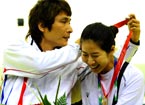 Chinese judo athletes celebrate after winning the titles
